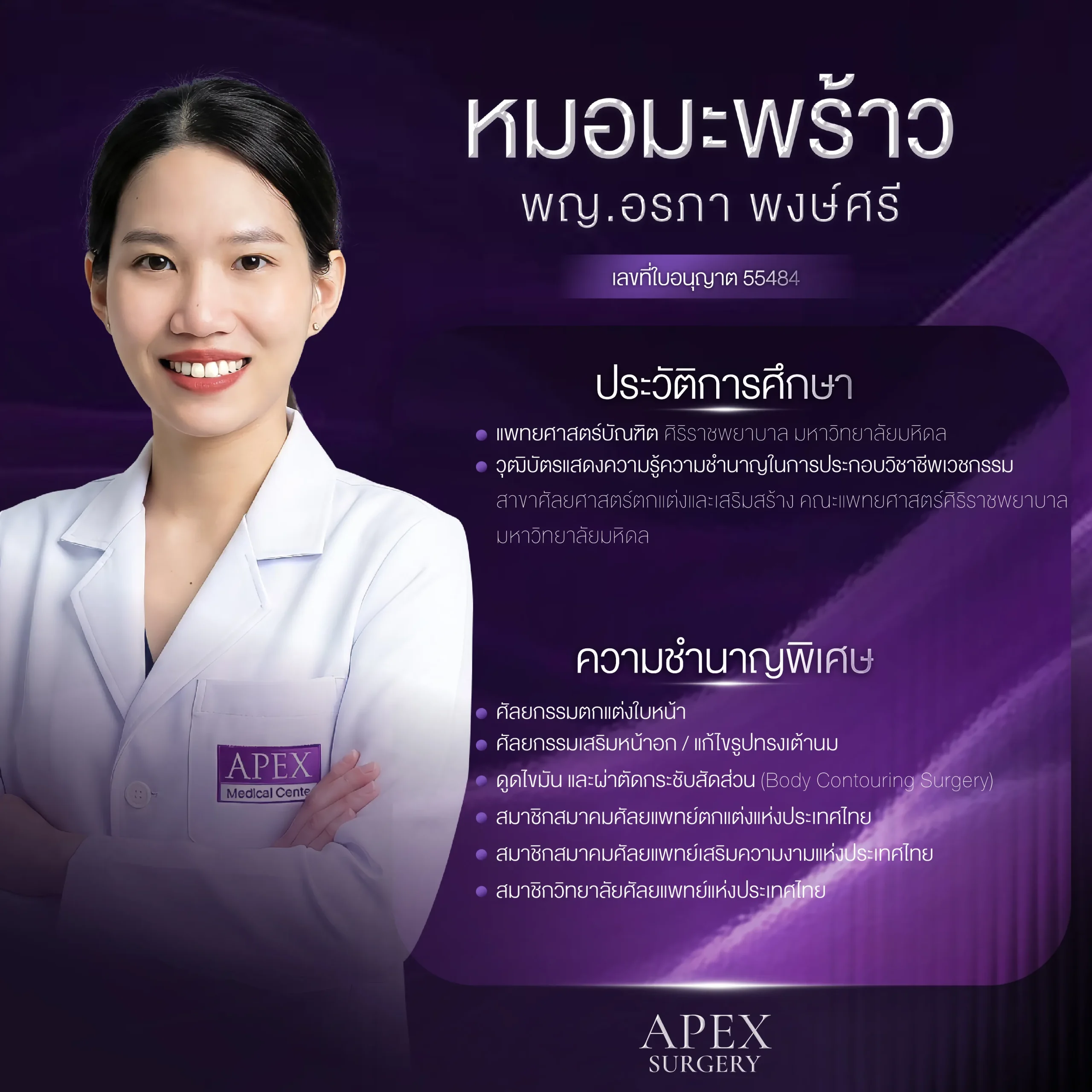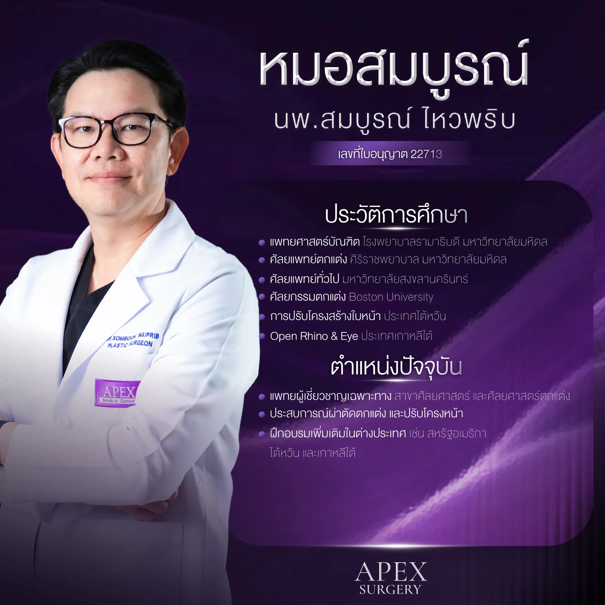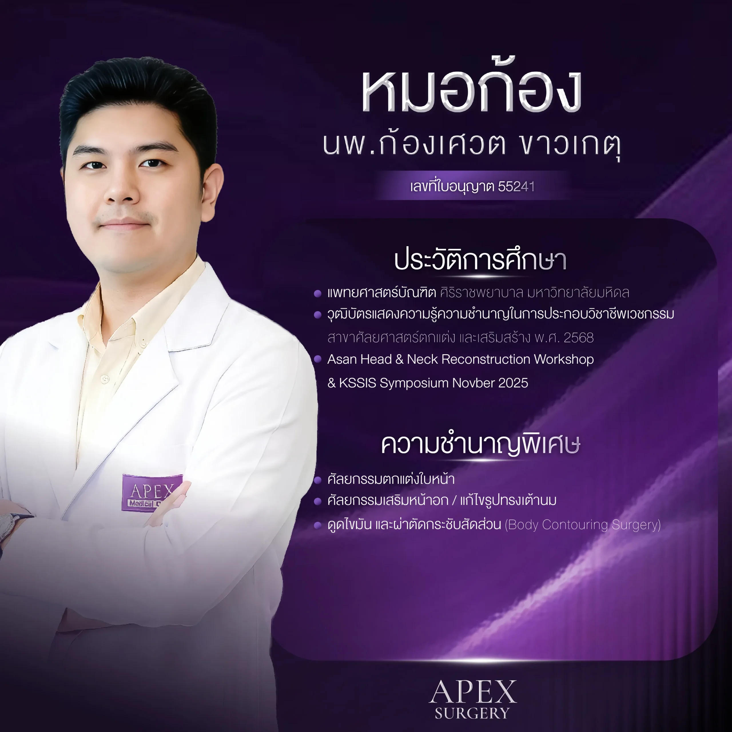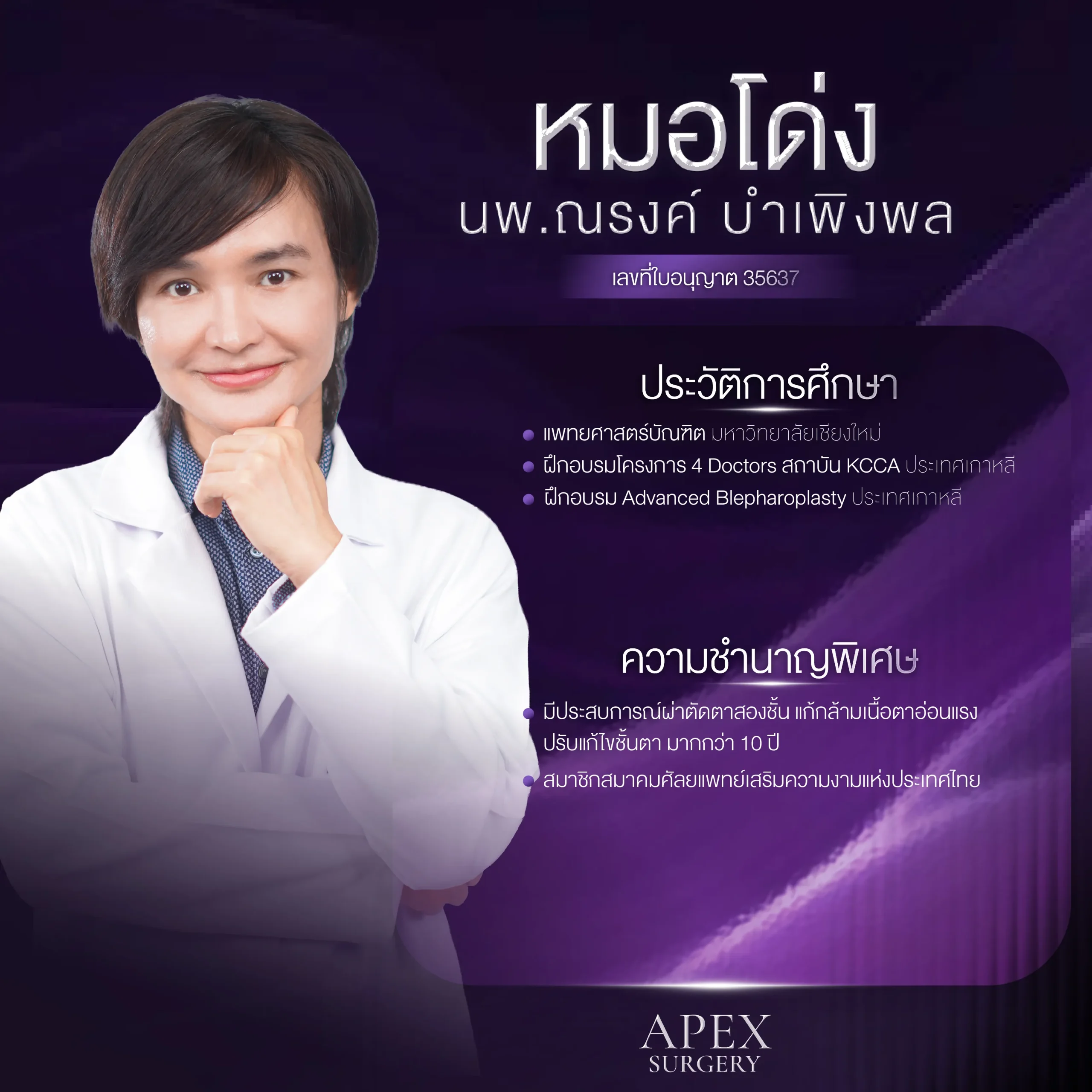 ภายใต้การดูแลของเครือ Apex Medical Center ที่มุ่งเน้นการแก้ไขปัญหาตาอย่างลึกซึ้งครอบคลุมทุกมิติ ทั้งโครงสร้าง ผิวหนัง ไขมัน และกล้ามเนื้อรอบดวงตา